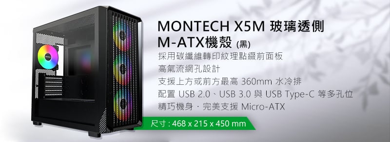 - 電腦機殼:MONTECH X5M 玻璃透側 M-ATX 黑