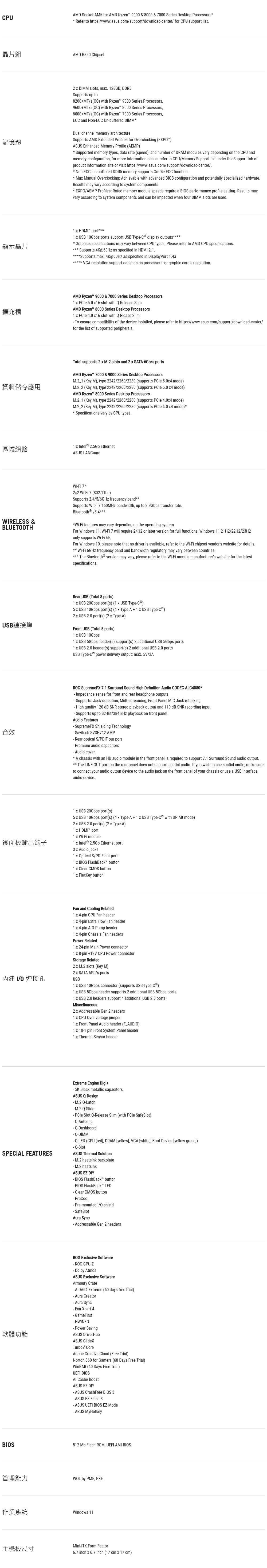 ASUS 華碩 ROG STRIX B850-I GAMING WIFI7 W AM5主機板(ITX/3+2年保)