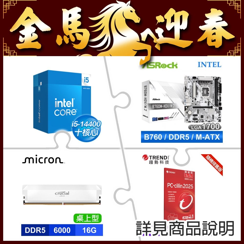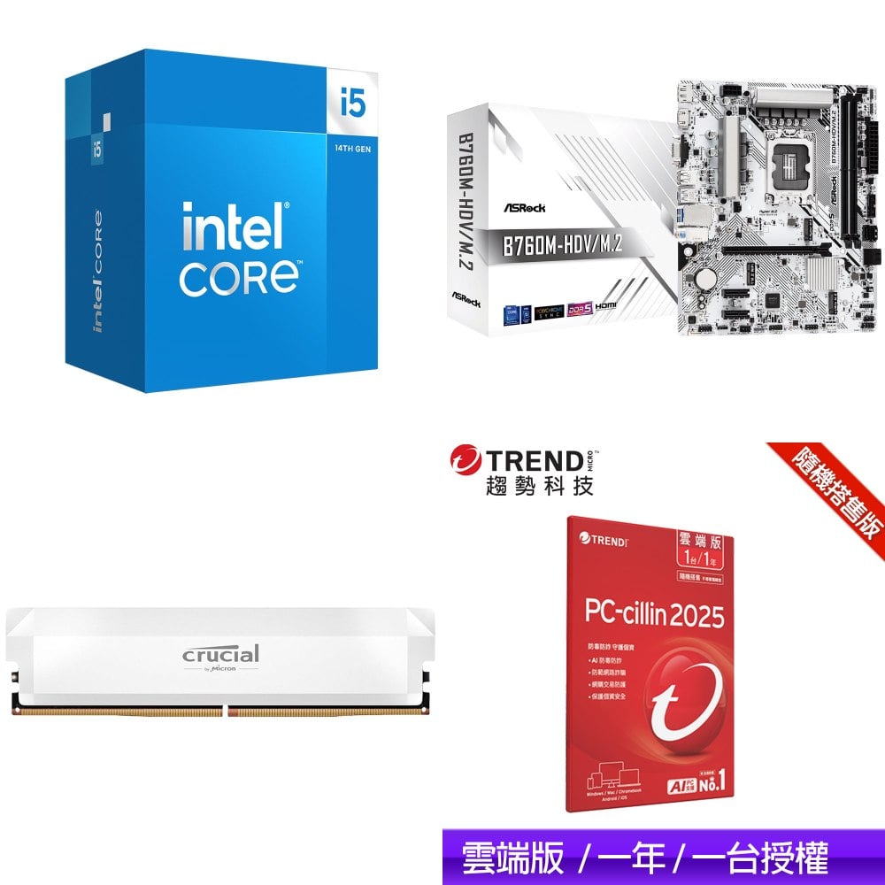 ☆期間限定★ i5-14400+華擎 B760M-HDV/M.2 D5 M-ATX主機板+美光 Crucial PRO DDR5 6000 16G CL36 白 記憶體★送PC-cillin 2025 雲端版 一年一台 隨機版
