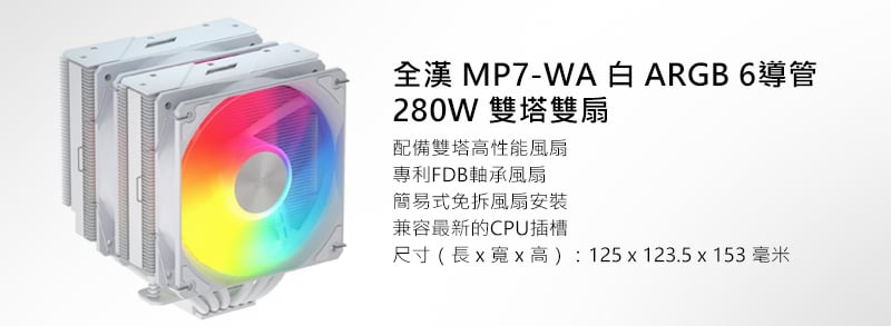 - CPU散熱風扇:全漢 MP7-WA ARGB 6導管 280W 白