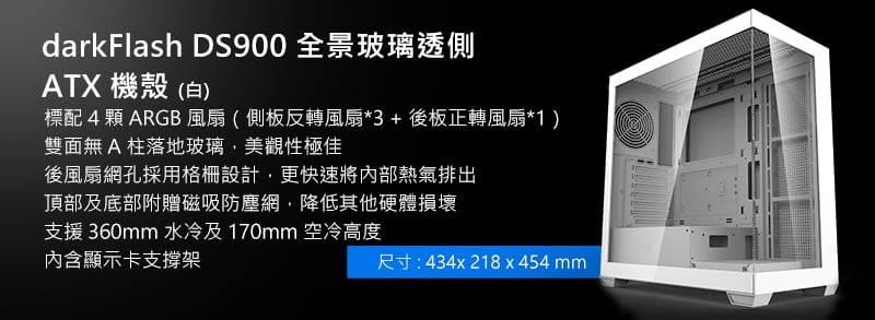 - 電腦機殼:darkFlash DS900 全景玻璃透側 ATX 白