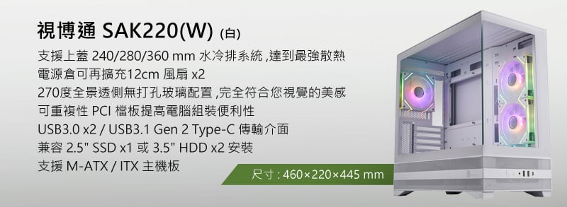 - 電腦機殼:視博通 SAK220(W) 全景玻璃透側 M-ATX 白