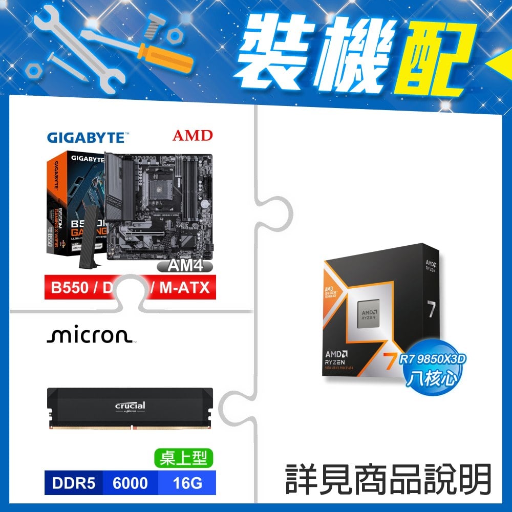 ☆裝機配★ AMD R7 9850X3D+技嘉 B550M GAMING X WIFI6 D4 MATX主機板+美光 Crucial PRO DDR5-6000 16G 記憶體
