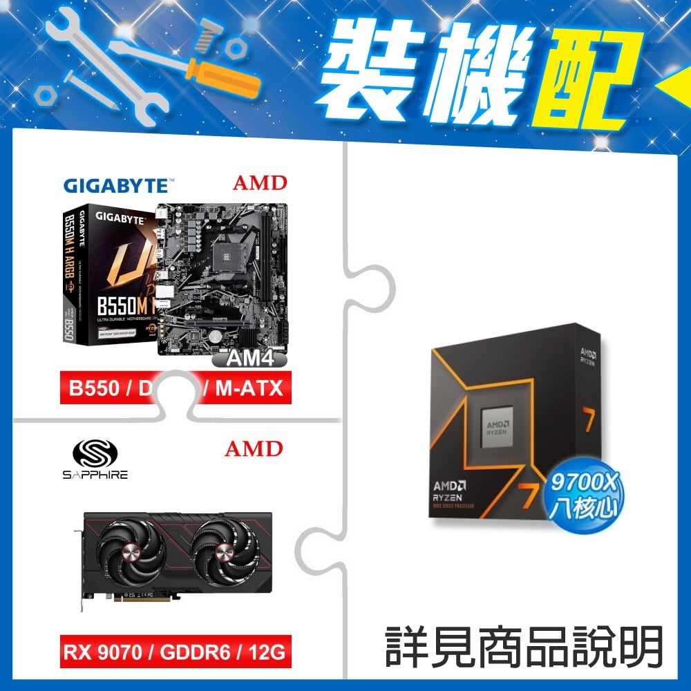 ☆裝機配★ AMD R7 9700X+技嘉 B550M H ARGB D4 MATX主機板+藍寶石 PULSE 脈動 RX 9070 GRE GAMING 12GB 顯示卡
