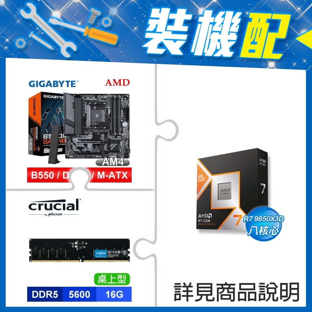 ☆裝機配★ AMD R7 9850X3D+技嘉 B550M GAMING X WIFI6 D4 MATX主機板+美光 DDR5-5600 16G 記憶體