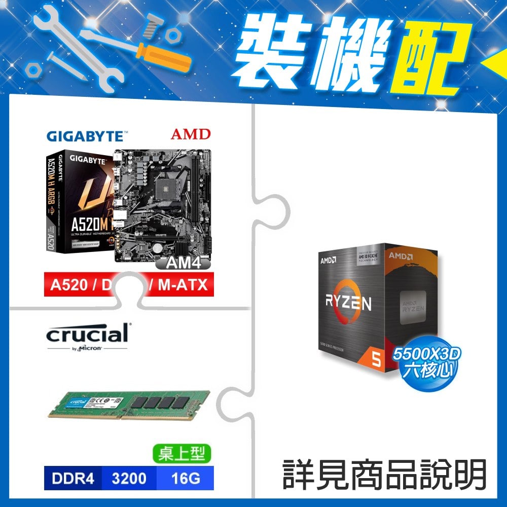 ☆裝機配★ AMD R5 5500X3D+技嘉 A520M H ARGB D4 MATX主機板+美光 DDR4-3200 16G 記憶體