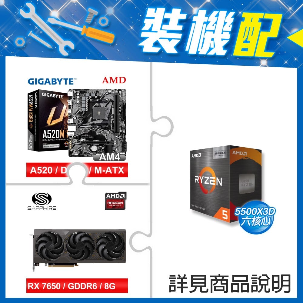 ☆裝機配★ AMD R5 5500X3D+技嘉 A520M H ARGB D4 MATX主機板+藍寶石 黑鑽版 RX 7650 GRE GAMING OC 8GB 顯示卡