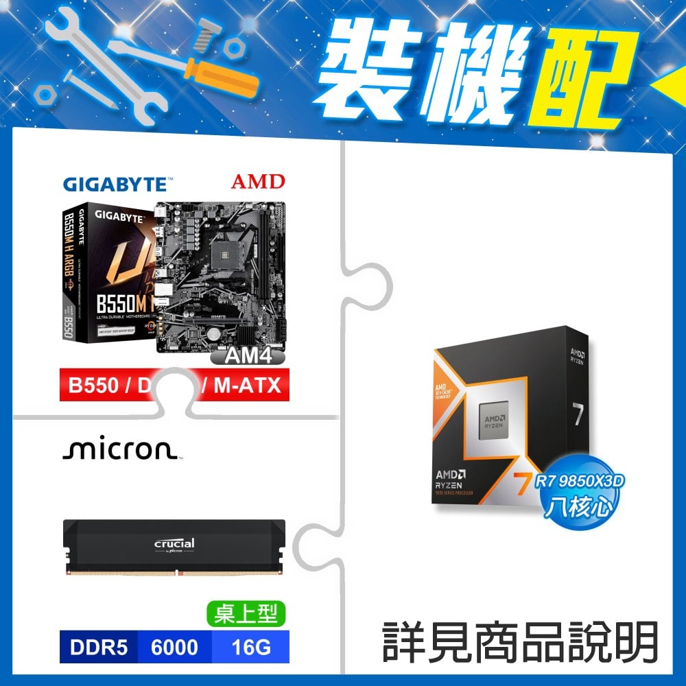 ☆裝機配★ AMD R7 9850X3D+技嘉 B550M H ARGB D4 MATX主機板+美光 Crucial PRO DDR5-6000 16G 記憶體