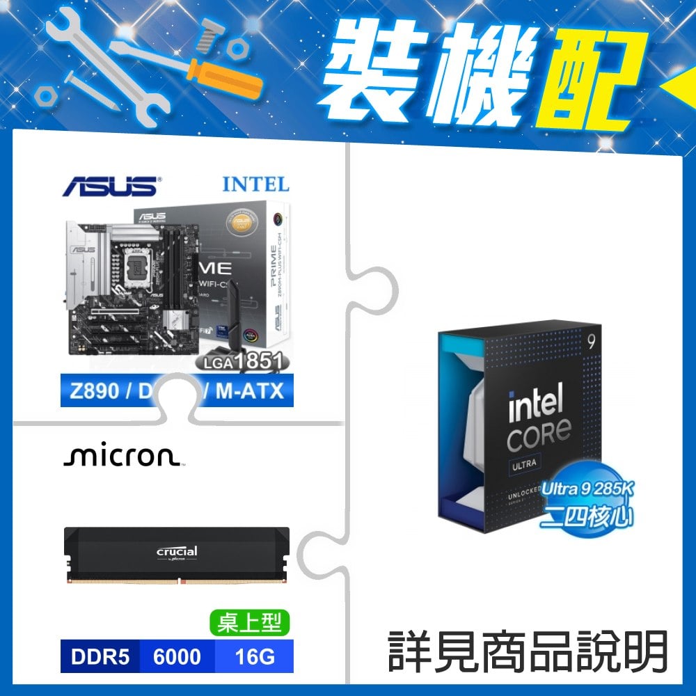 ☆裝機配★ Core U9 285K+華碩 PRIME Z890M-PLUS WIFI-CSM D5 M-ATX主機板+美光 Crucial PRO DDR5-6000 16G 記憶體