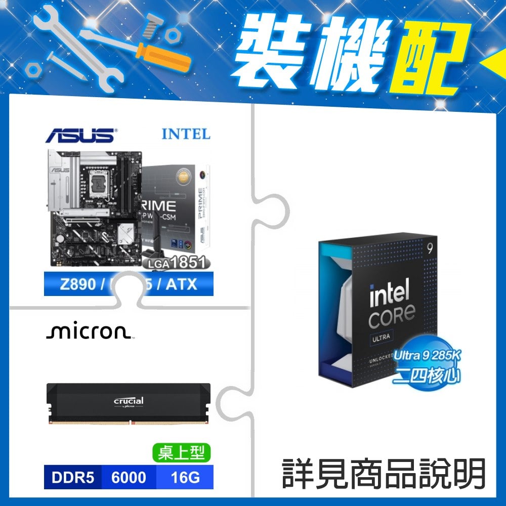 ☆裝機配★ Core U9 285K+華碩 PRIME Z890-P WIFI-CSM D5 ATX主機板+美光 Crucial PRO DDR5-6000 16G 記憶體