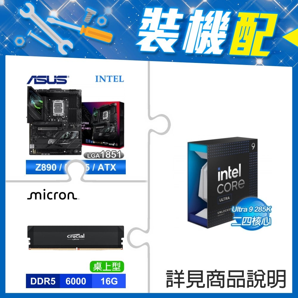 ☆裝機配★ Core U9 285K+華碩 ROG STRIX Z890-F GAMING WIFI D5 ATX主機板+美光 Crucial PRO DDR5-6000 16G 記憶體