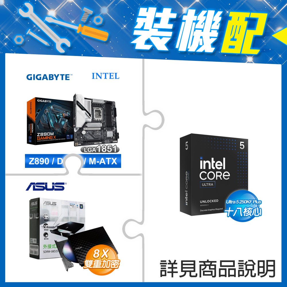 ☆裝機配★ Ultra5 250K Plus+技嘉 Z890M GAMING X D5 MATX主機板+華碩 SDRW-08D2S-U 外接式燒錄機《黑》
