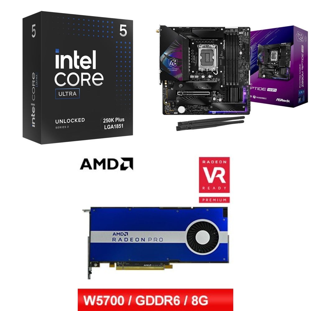☆裝機配★ Ultra5 250K Plus+華擎 Z890M Riptide WiFi D5 MATX主機板+AMD RadeonPro W5700 8G 256bit專業繪圖卡