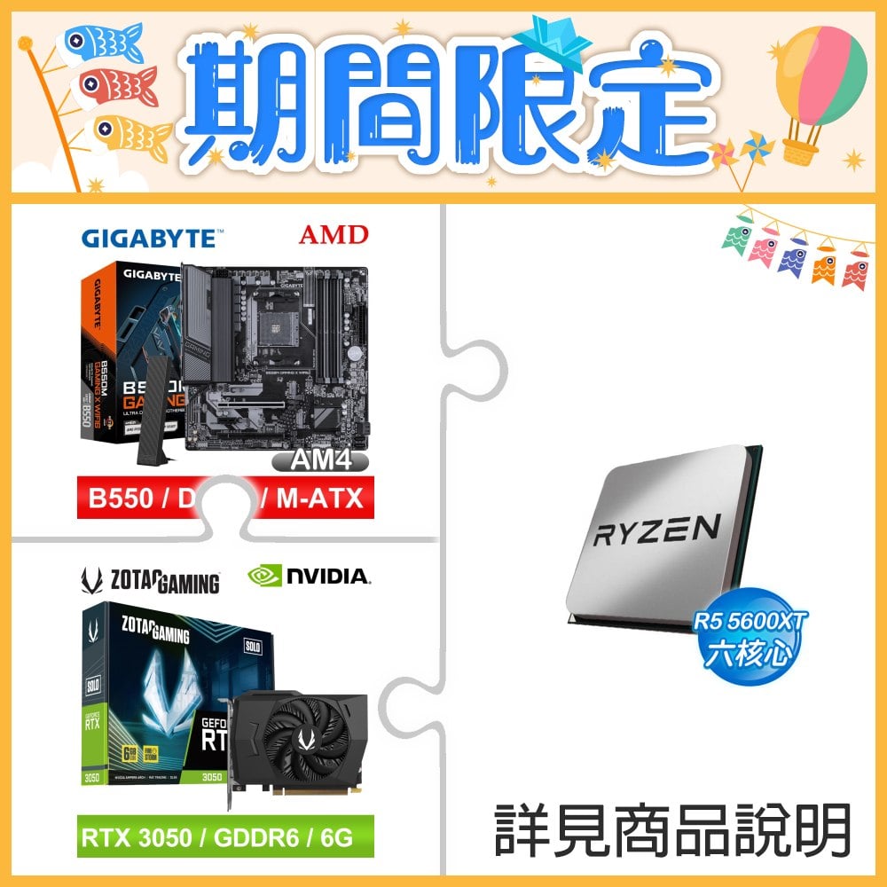 ☆期間限定★ AMD R5 5600XT MPK+技嘉 B550M GAMING X WIFI6 MATX 主機板+索泰 RTX 3050 6G GDDR6 Solo 顯示卡
