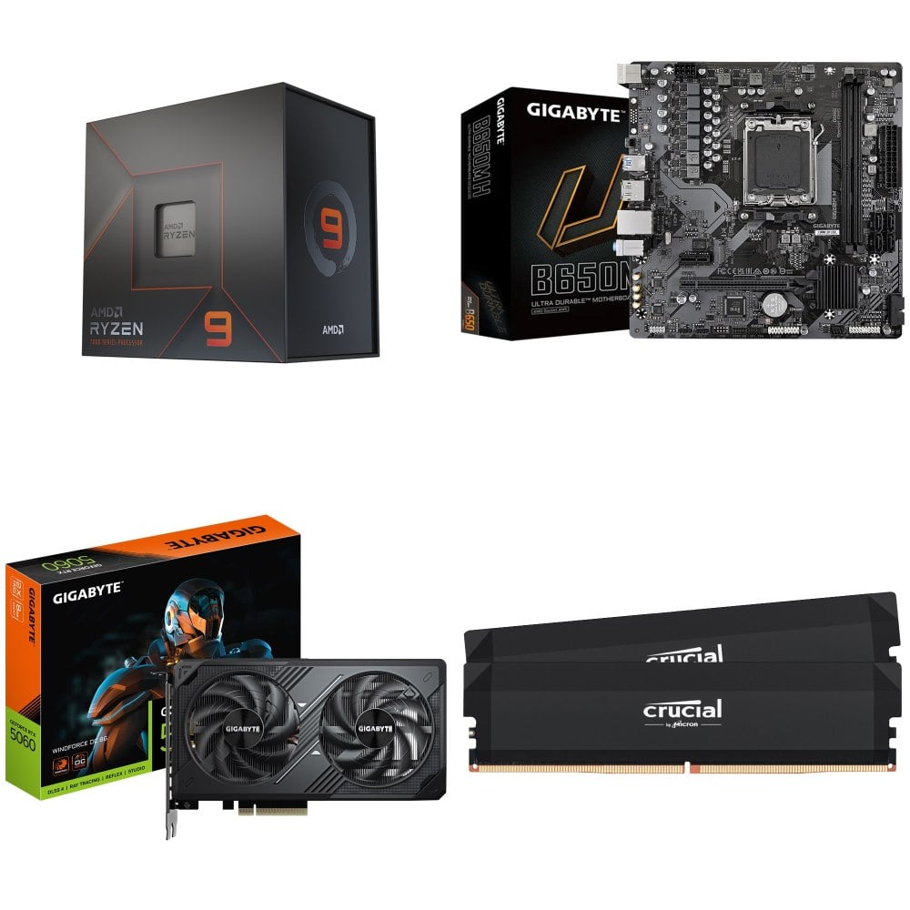 ☆期間限定★ AMD R9 7950X+技嘉 B650M H M-ATX主機板+技嘉 RTX 5060 WINDFORCE OC 8G 顯示卡+美光Crucial PRO DDR5-6000 16G*2黑 記憶體