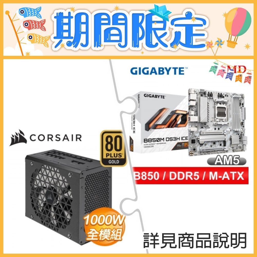 ☆期間限定★ 技嘉 B850M DS3H ICE MATX 主機板+海盜船 RM1000x SHIFT 金牌全模ATX3.1電供