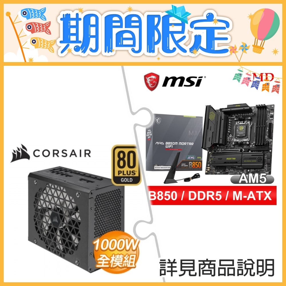 ☆期間限定★ 微星 MAG B850M MORTAR WIFI M-ATX主機板+海盜船 RM1000x SHIFT 金牌全模ATX3.1電供