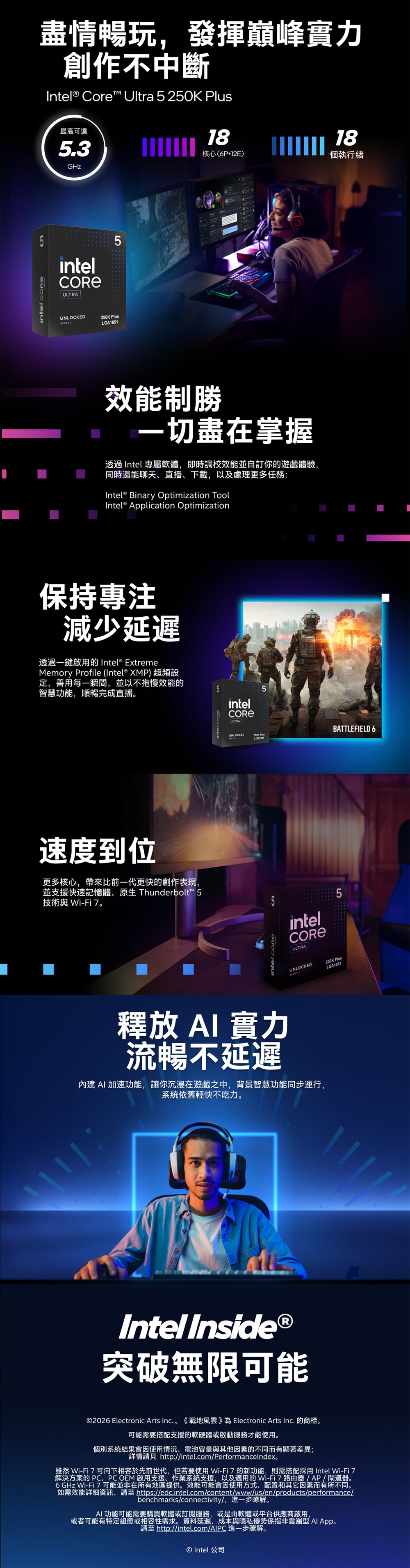 Intel Core Ultra 5 250K Plus 18核18緒 另加NPU 的 AI 處理器(Core Ultra 200S)《4.2Ghz/LGA1851/不含風扇》(代理商貨)