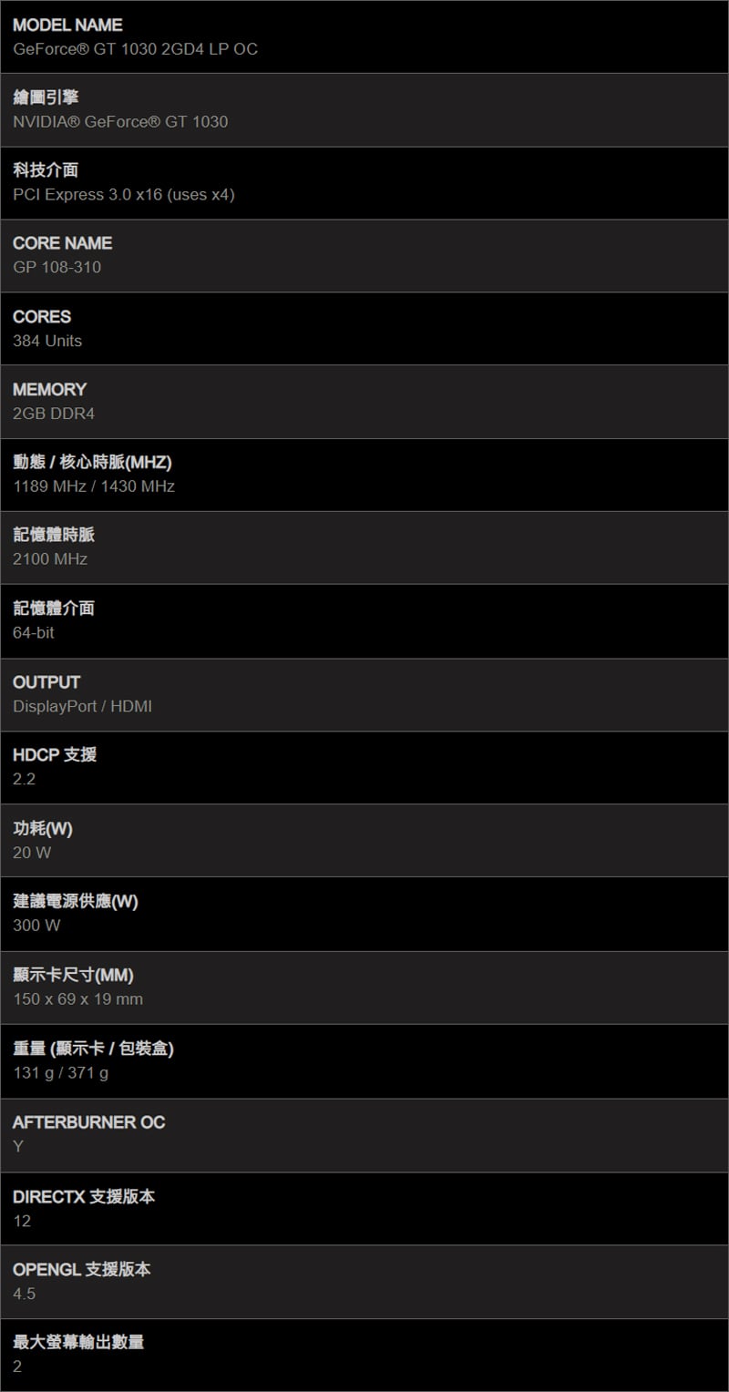 - [2] MSI 微星 GT 1030 2GD4 LP OC 顯示卡《原廠三年保固》