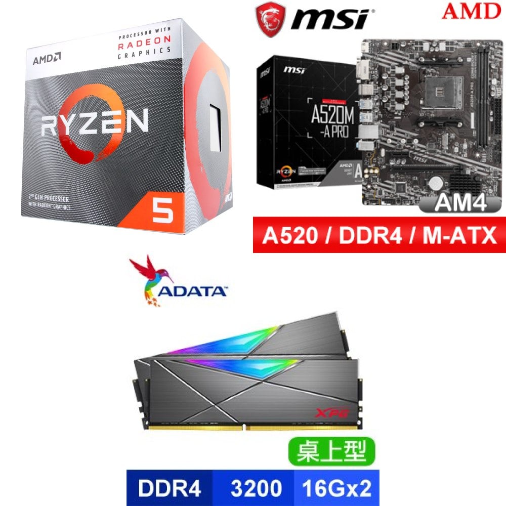 ☆期間限定★ AMD Ryzen 5 3400G SR1+微星 A520M-A PRO M-ATX主機板+威剛 D50 DDR4-3200 16G*2 灰 RGB 記憶體