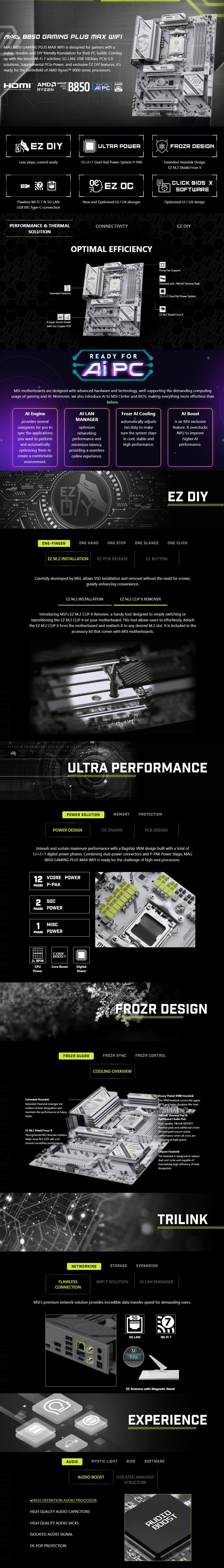 - Frozr Guard: Extended Heatsink, MOSFET thermal pads rated for 7W/mK, additional choke thermal pads and EZ M.2 Shield Frozr II are built for high performance system and non-stop experience
