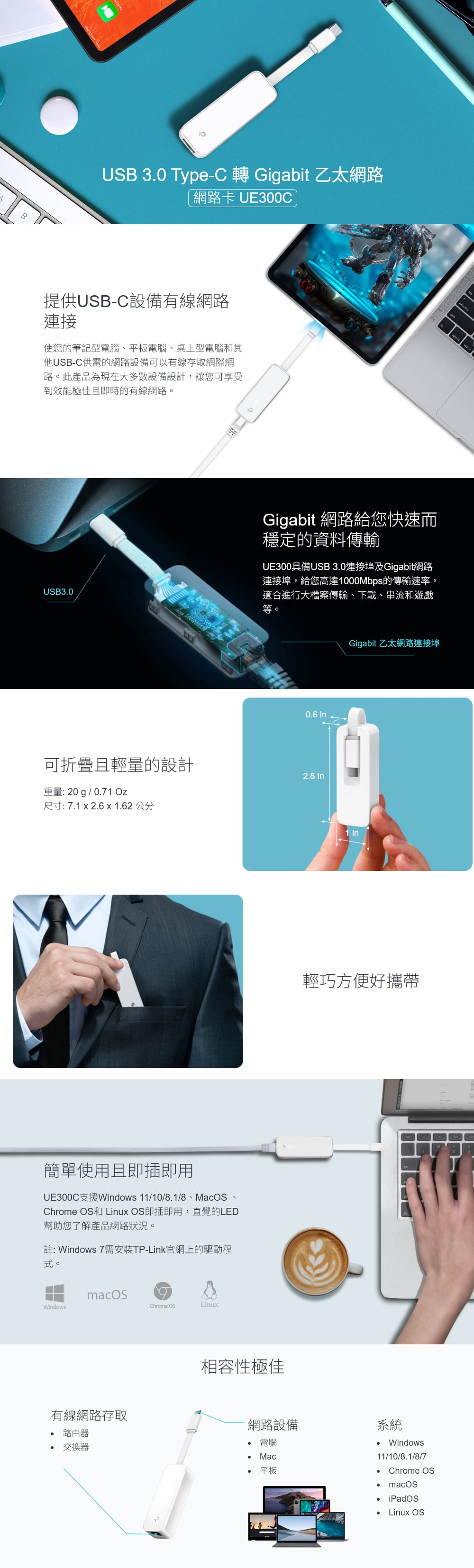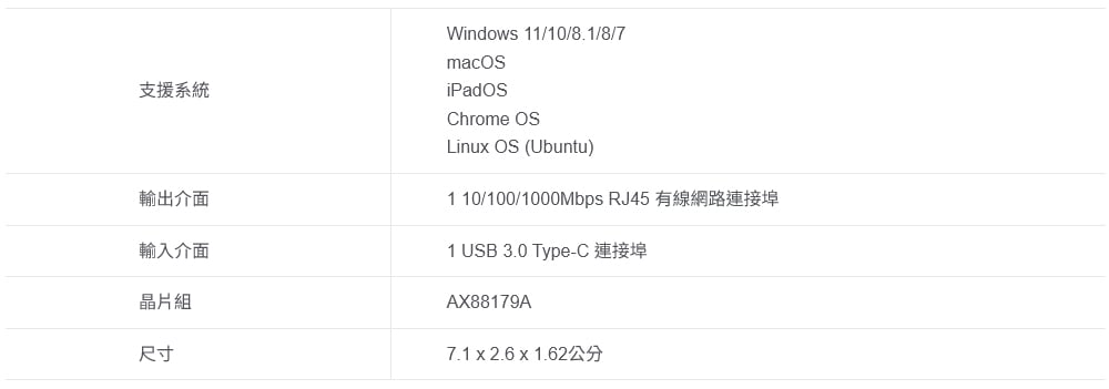 • 適合筆記型電腦、平板電腦和大部分USB-C供電的網路設備存取有線網路
