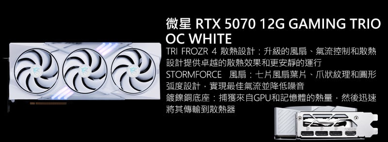 • 顯示卡:微星 RTX 5070 12G GAMING TRIO OC WHITE