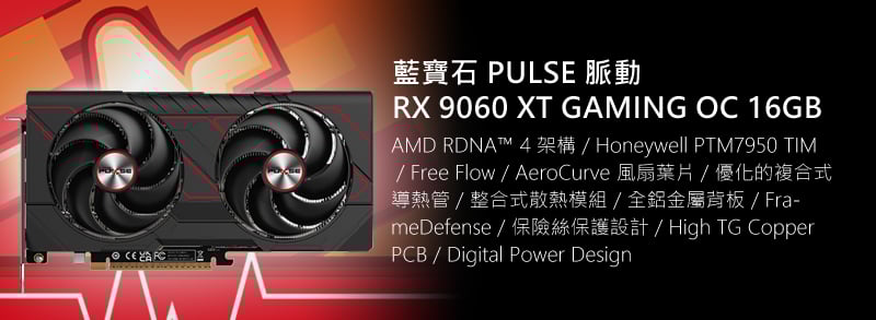 - 顯示卡:藍寶石 PULSE 脈動 RX 9060 XT GAMING OC 16GB