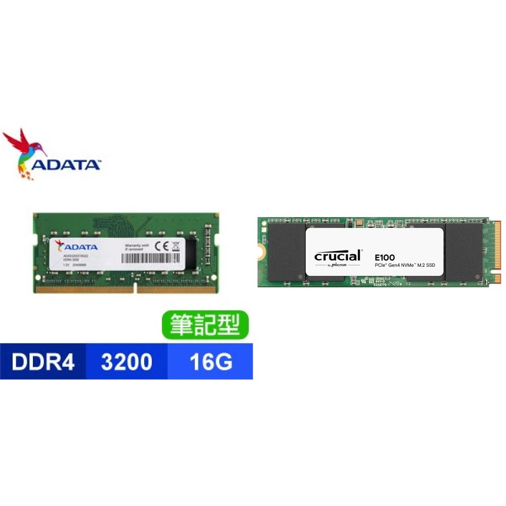 ☆期間限定★ 威剛 DDR4-3200 16G NB記憶體+美光 Crucial E100 480GB M.2 PCIe SSD