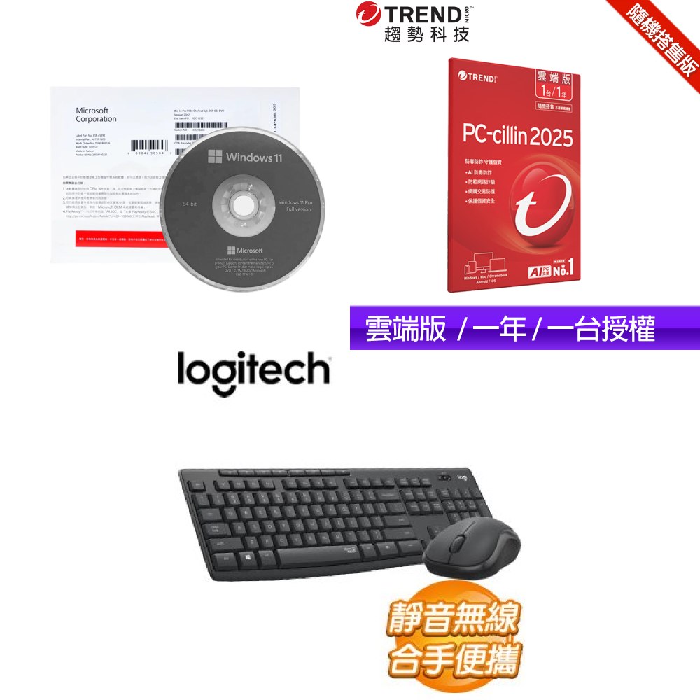 ☆期間限定★ Windows 11 Pro 64bit 專業隨機版《含DVD》+PC-cillin 2025 雲端版 一年一台 隨機版+羅技 MK295 無線靜音鍵鼠組-石墨灰