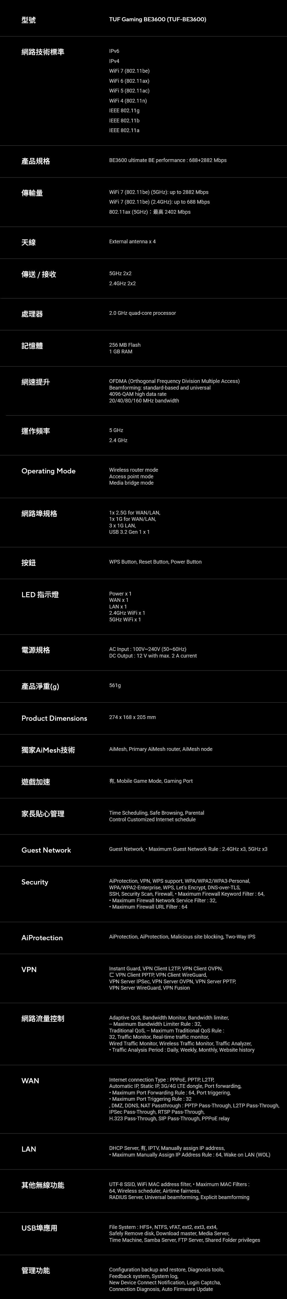 - [1] ASUS 華碩 TUF-BE3600 V2 雙頻 WiFi 7 電競路由器