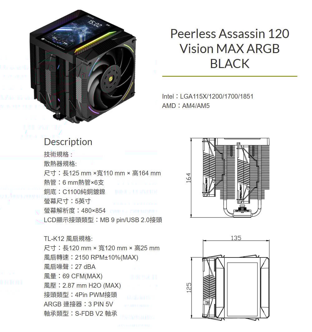 Thermalright 利民 Peerless Assassin 120 Vision MAX ARGB Black 黑 6導管 雙塔雙風扇 散熱器(高16.