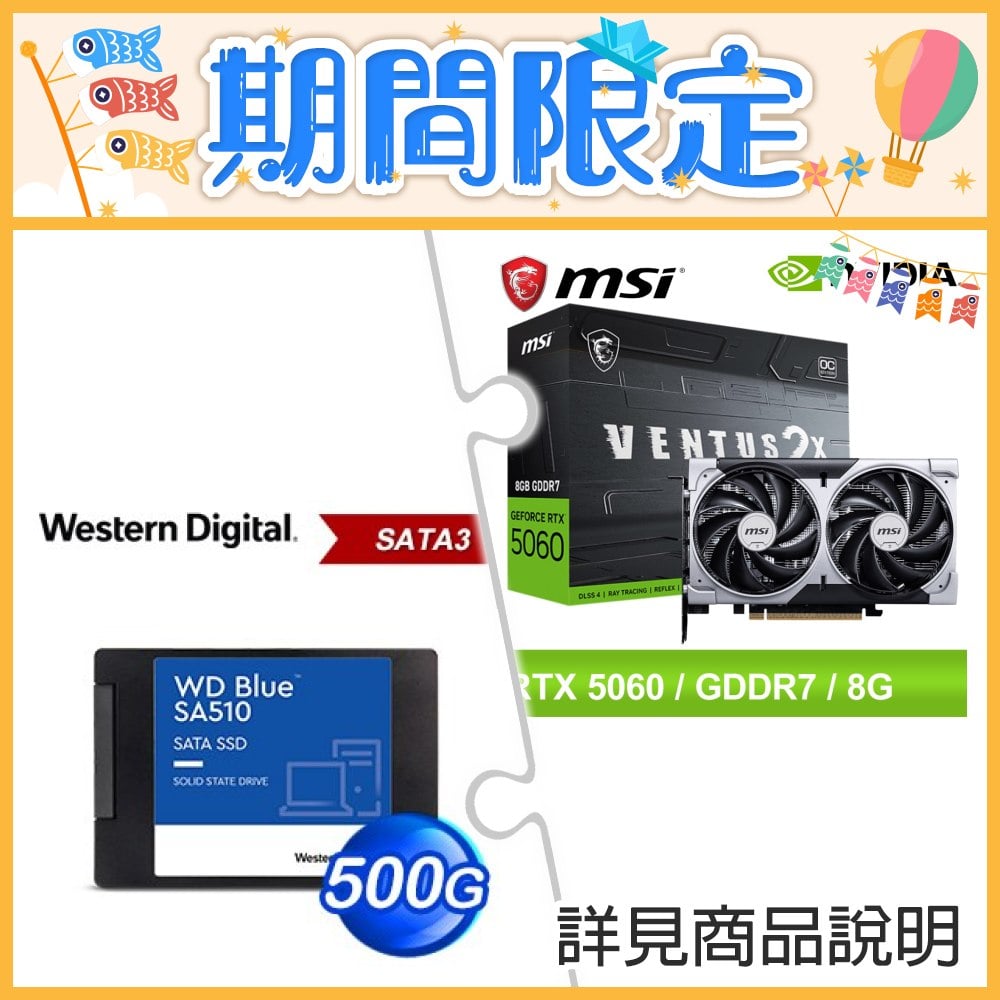 ☆期間限定★ 微星 RTX 5060 8G VENTUS 2X OC 顯示卡+WD 藍標 SA510 500GB 2.5吋 SATA SSD
