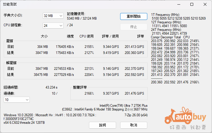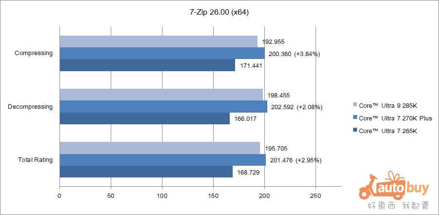 7-Zip 的效能測試下,270K Plus 之壓縮評效為 200.360 GIPS,解壓評效為 202.592 GIPS,整體評等為 201.476 GIPS。