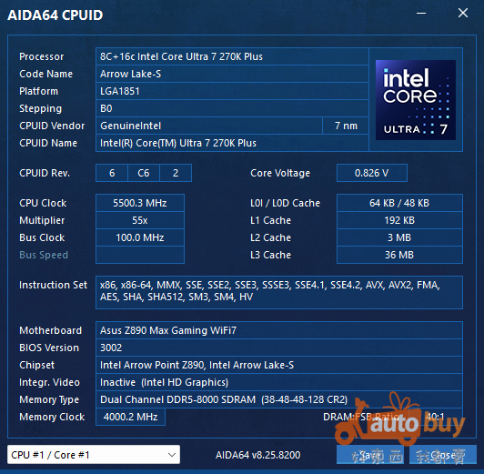 本次測試中特別選用金士頓 DDR5-8000 高速記憶體進行搭配,以驗證 Core Ultra Plus 平台在高頻記憶體環境下的相容性與穩定性,並進一步爭取更高的遊戲幀率表現。在 Core Ultra 7 270K Plus 搭配華碩 Z890 MAX GAMING WIFI7 主機板的組合下,金士頓 DDR5-8000 高速記憶體可正常運作,並成功以 XMP-8000 模式進行設定,整體運行穩定,未出現相容性問題。