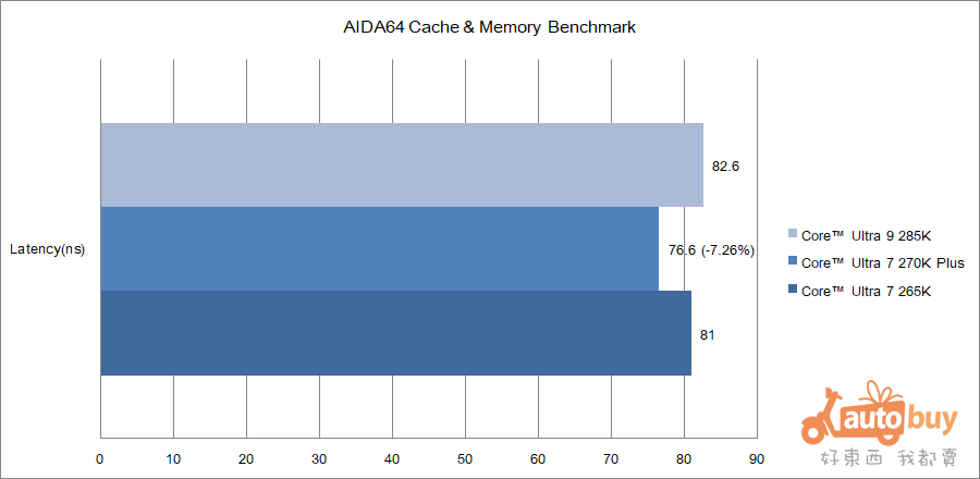 與對照組相比,受惠於 D2D 頻率提升,Core Ultra 7 270K Plus 的記憶體延遲進一步壓低至 76.6 ns;相較於 Core Ultra 9 285K 的 82.6 ns,縮短約 7.26%。此一改善對於高度依賴記憶體延遲的應用情境(如遊戲)將帶來實質助益。