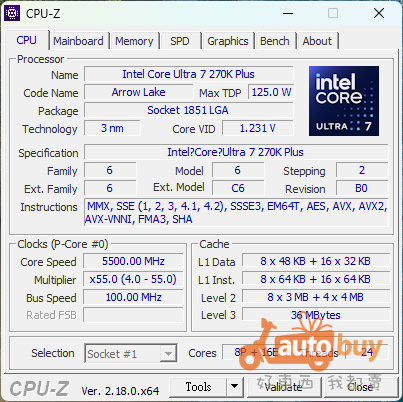 於 CPU-Z 2.18.0 版本中有正確抓到型號:Intel Core Ultra 7 270K Plus,核心配置 8P+16E,L3 快取 36MB。