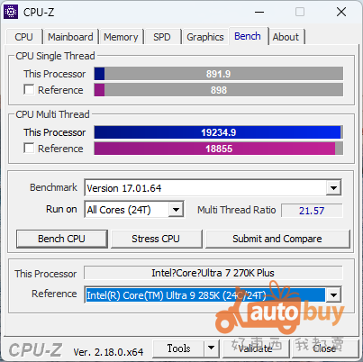 執行 CPU-Z 2.18.0.x64 中 17.01.64 版性能測試,Core Ultra 7 270K Plus 得到單核 891.9 分,多核 19,234.9 分。