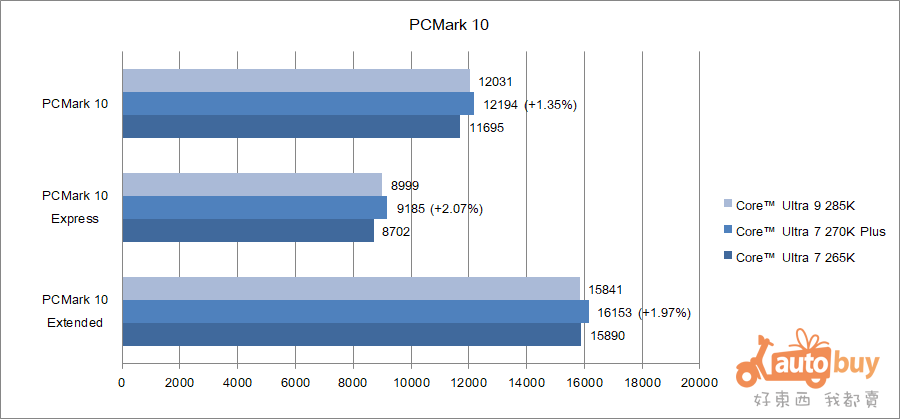 在 PCMark 10 測試中,Core Ultra 7 270K Plus 取得 12,194 分的綜合性能評分;此外,在 PCMark 10 Express 與 Extended 項目中,亦分別獲得 9,185 分與 16,153 分的亮眼成績。三項測試的 PR 值皆超過 99%,顯示其在實際日常與生產力應用表現上具備極為突出的競爭力。