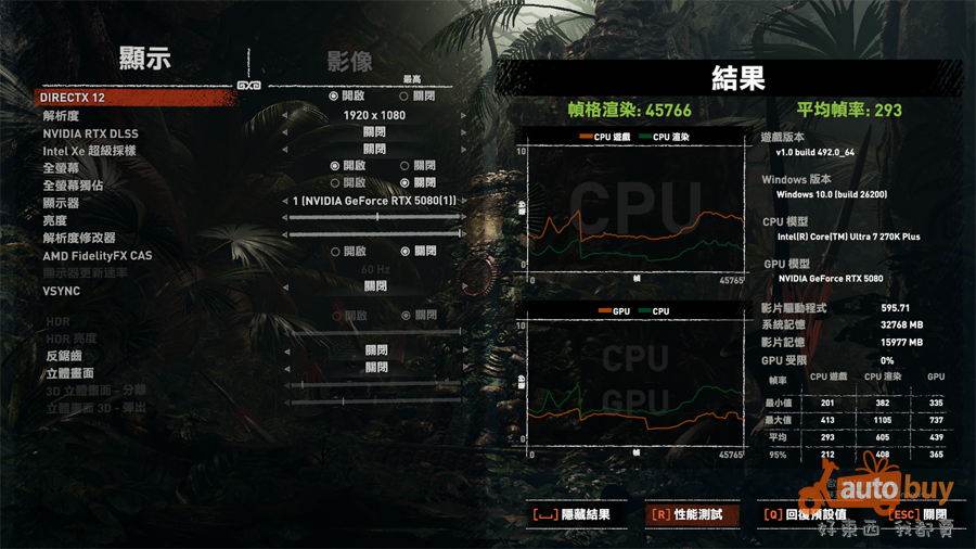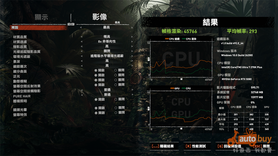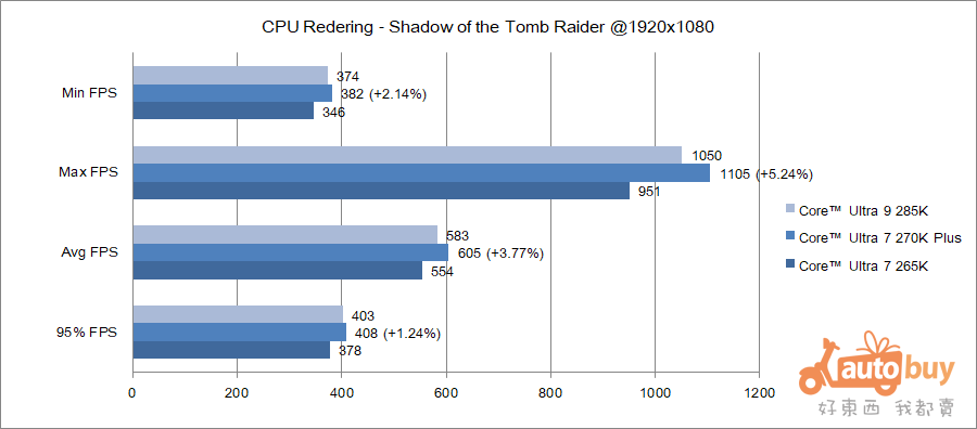 《古墓奇兵:暗影》測試結果顯示,Core Ultra 7 270K Plus 在整體遊戲表現上達到平均 293 FPS;其中 CPU 渲染幀率更高達平均 605 FPS,反映其在處理器運算密集場景中的優勢。