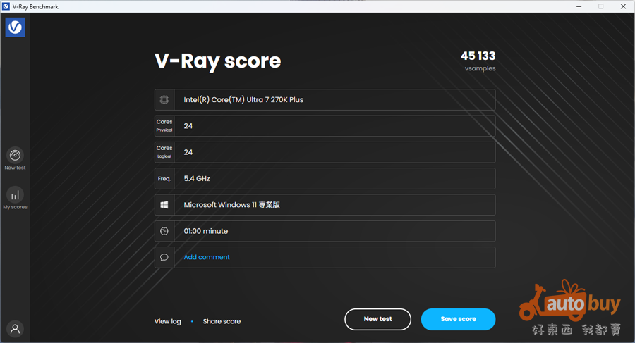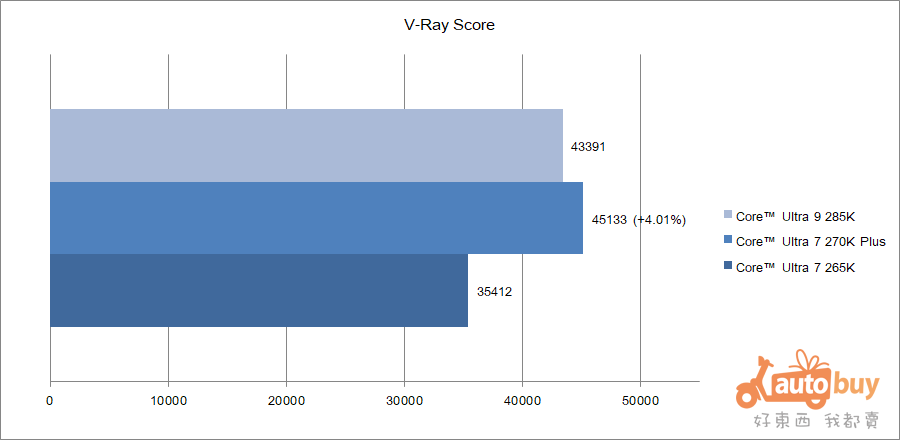 Core Ultra 270K Plus 於 V-Ray Benchmark 之處理器渲染效能測試中獲得 45,133 vsamples。