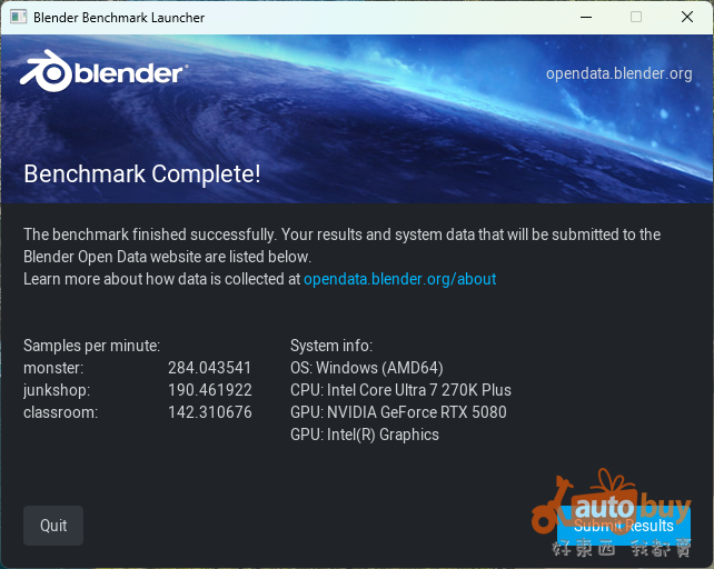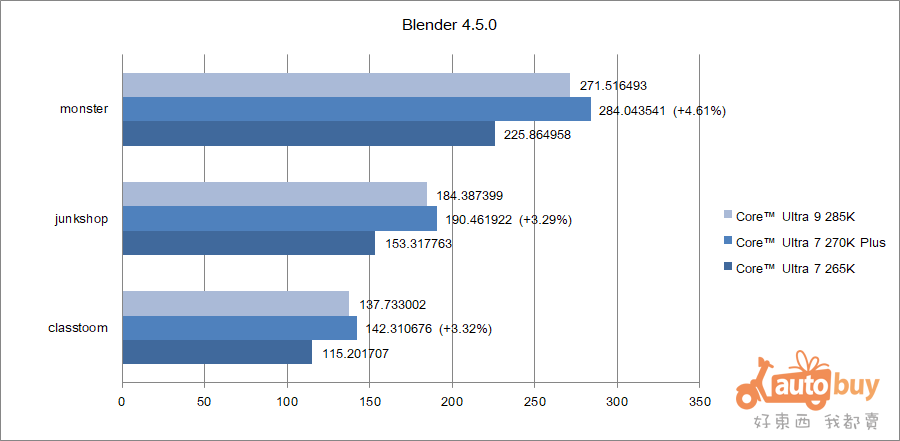 本次 Blender 測試選用三個不同場景專案,依複雜度差異評估處理器於 3D 渲染工作負載下的運算能力。Core Ultra 7 270K Plus 在三項測試中皆維持穩定輸出,分別在 monster、junkshop 與 classroom 專案中取得 284.04、190.46 與 142.31 分,展現出不錯的多執行緒渲染實力。