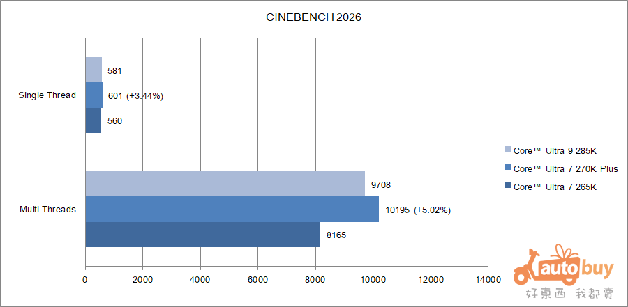 CINEBENCH 2026 主要用來衡量 CPU 的圖形渲染能力。新款 Core Ultra 7 270K Plus 在單執行緒獲得 601 pts,多執行緒方面則為 10,195 pts。