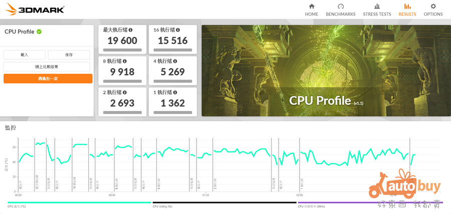 CPU Profile 測試的是 CPU 在特定數量執行緒下的遊戲效能表現。270K Plus 於全核獲得 19,600 分,而另外於 16/8/4/2/1 執行緒中獲得 15,516/9,918/5,269/2,693/1,362 分。