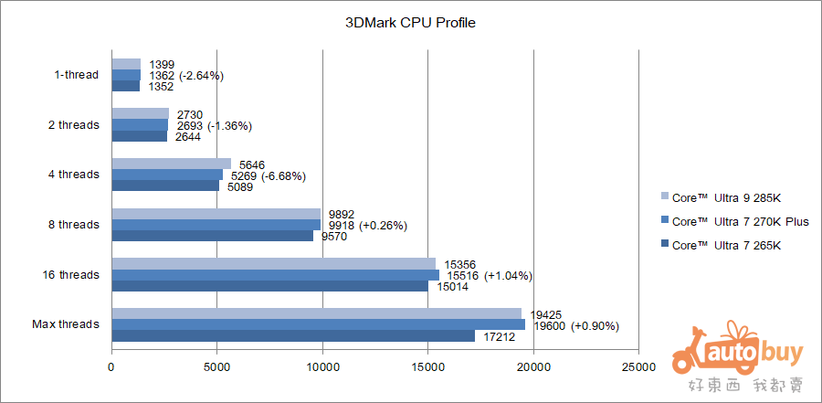 受益於 D2D 頻率提升,270K Plus 在對比 285K 時展現約 2.46% 的性能優勢;而相較於 265K,領先幅度則進一步擴大至約 3.90%。