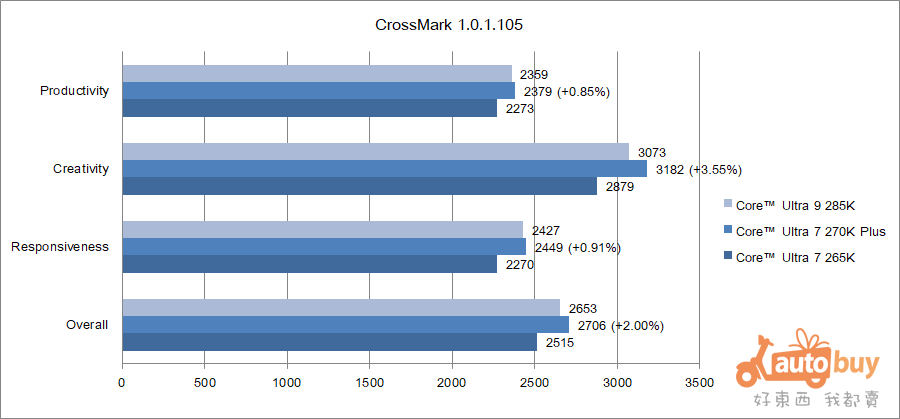 CrossMark 與前文提及的 PCMark 10 類似,同樣著重於模擬日常使用情境,以評估系統在實際應用中的整體表現。在此測試中,270K Plus 取得 2,706 分的佳績,顯示其在日常應用與整體效能方面具備穩定且優異的表現。