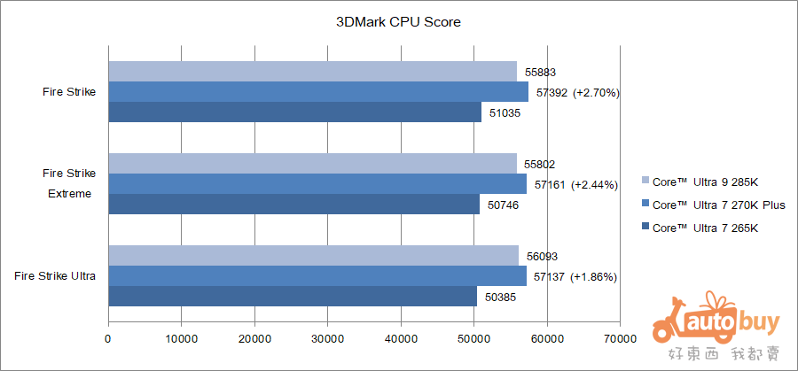 此外,在 DX11 環境下的 Fire Strike Extreme/Ultra 測試中,Core Ultra 7 270K Plus 分別取得 57,392、57,161 與 57,137 分的物理效能成績。