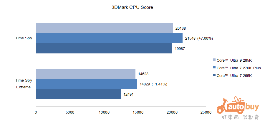 與對照組相比,270K Plus 在各項測試中相較 265K 領先約 23.53% 至 25.76%。此外,與 285K 相比,270K Plus 亦展現出 3.29% 至 4.61% 的性能優勢。