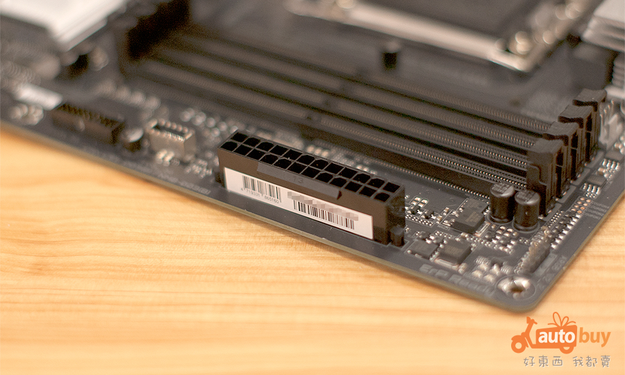 主機板右上方配置標準 24-pin ATX 主電源接頭,為整體系統提供穩定且充足的電力輸入,確保各項元件運作無虞。