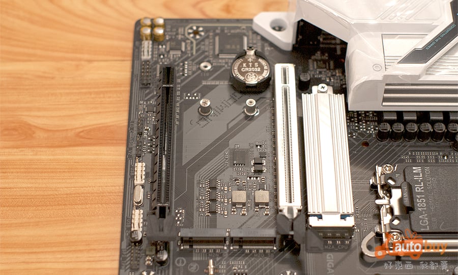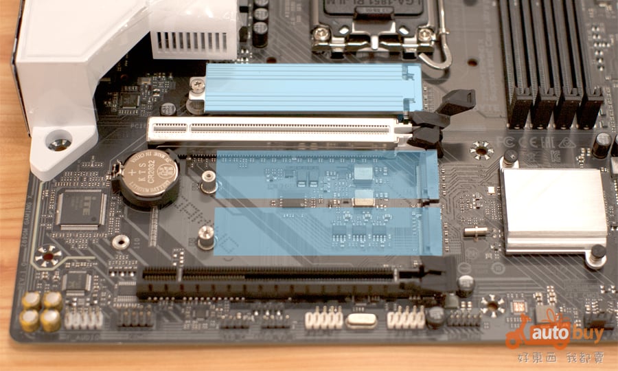 另一組插槽則由晶片組提供通道,為 PCIe 4.0 x4 規格,適合用於擴充卡或其他高速裝置,兼顧彈性與實用性。